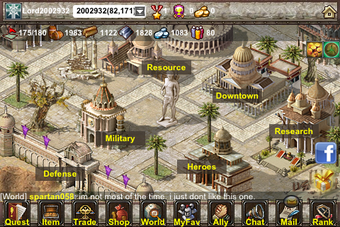 Roman Empire の説明書きはすべて英語となりますが、ゲームの進め方についてはガイダンスが出て、タップすべきボタンが点滅するなど、進めやすくなっています。ダウンタウンやミリタリーなど都市にはいくつかの建物があり、ゲーム内でそれらの機能レベルをあげていきます。また、指示に従って、食糧や鉄などの資源を集め、都市の構築と兵士の増強に努めます。